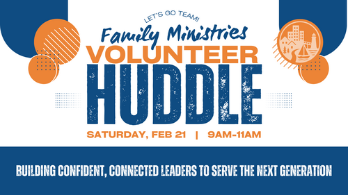 Family Ministries volunteers, we want to invite you to our Family Ministries Volunteer Huddle on Saturday, February 21, from 9 to 11 AM.